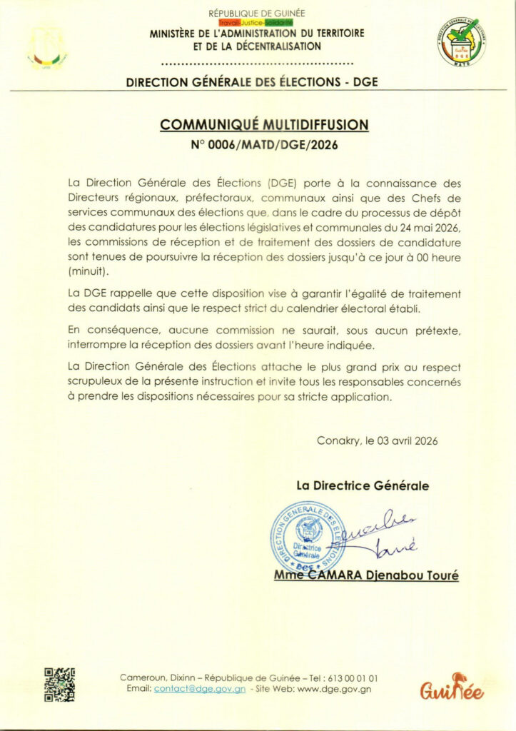 COMMUNIQUE MULTIDIFFUSION DE LA DIRECTION GENERALE DES ELECTIONS-DGE N°0006-MATD-DGE-2026 DU 03042026