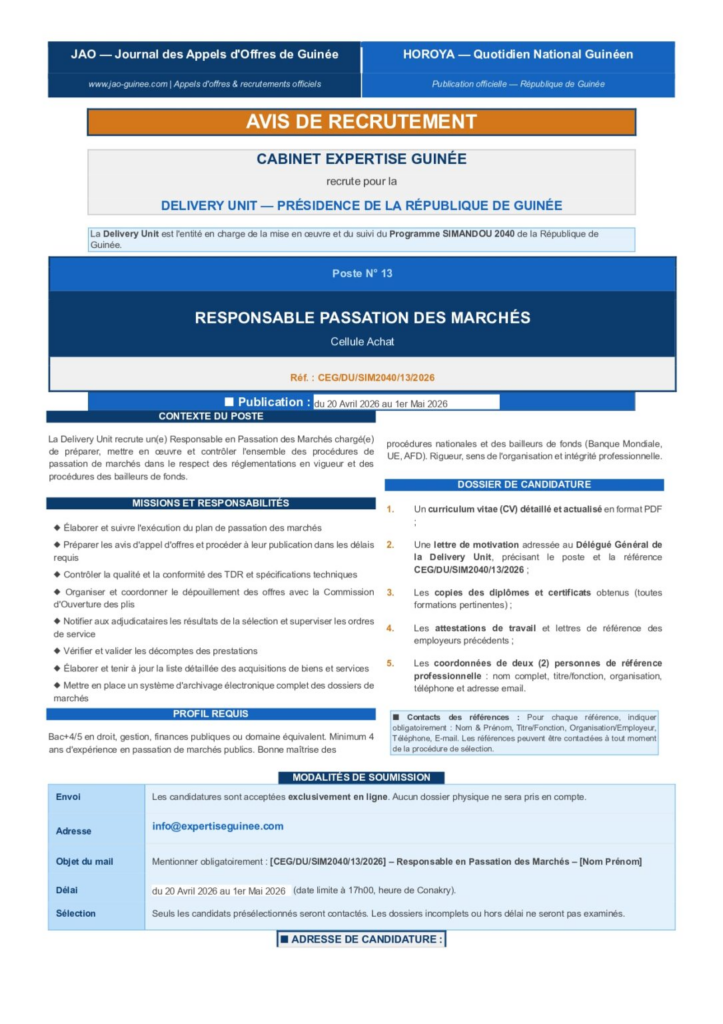 • AVIS DE RECRUTEMENT D’UN CHARGÉ PASSATION DE MARCHÉS
