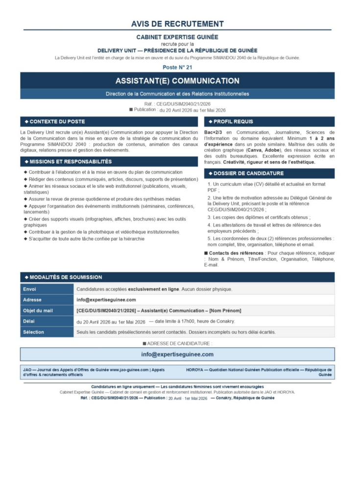 AVIS DE RECRUTEMENT D’UN(E) ASSISTANT(E) COMMUNICATION