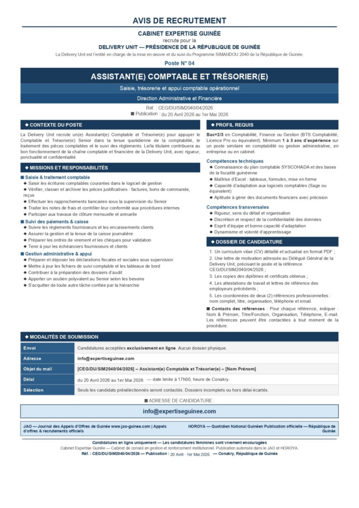 actualité Business AVIS DE RECRUTEMENT D’UN(E) ASSISTANT(E) COMPTABLE ET TRÉSORIER(E) 20 avril 202620 avril 2026 Nadège CAMARA Aucun commentaire