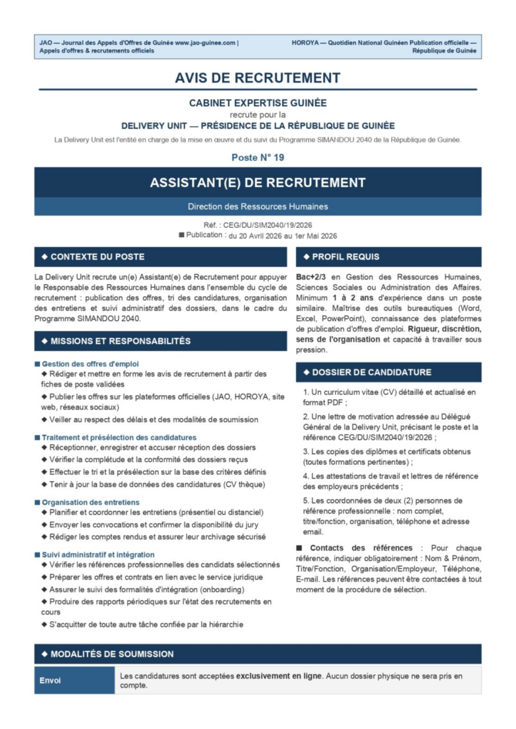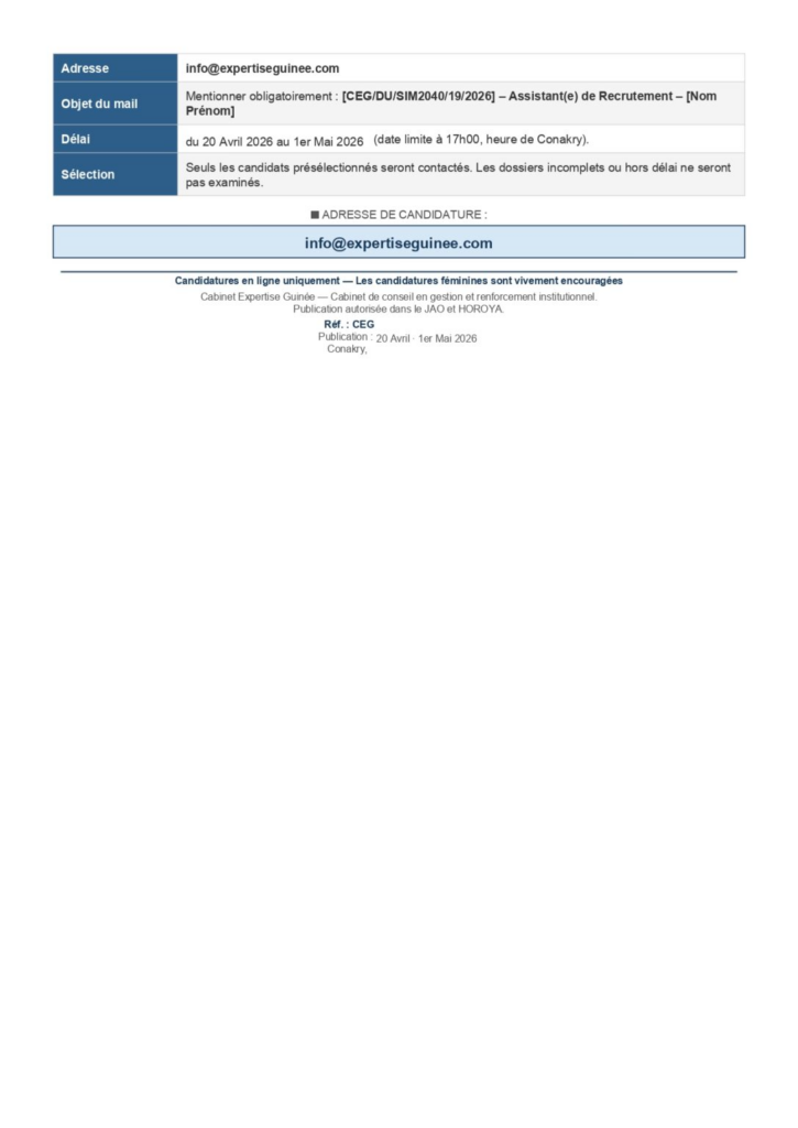 actualité Business AVIS DE RECRUTEMENT D’UN(E) ASSISTANT(E) DE RECRUTEMENT 20 avril 202620 avril 2026 Nadège CAMARA Aucun commentaire