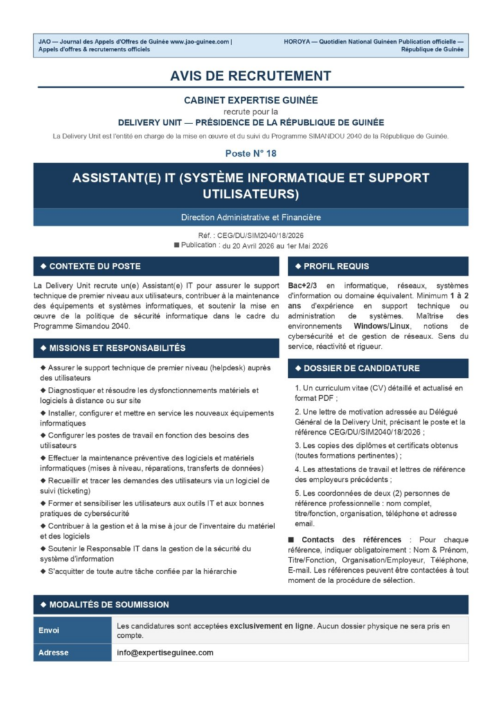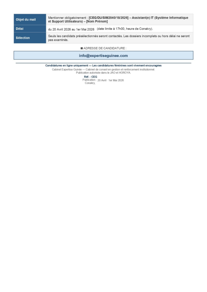 actualité Business AVIS DE RECRUTEMENT D’UN(E) ASSISTANT(E) IT (SYSTÈME INFORMATIQUE ET SUPPORT UTILISATEURS) 20 avril 202620 avril 2026 Nadège CAMARA Aucun commentaire