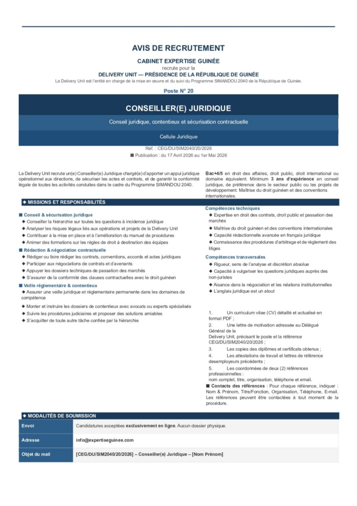actualité Business AVIS DE RECRUTEMENT D’UN(E) CONSEILLER(E) JURIDIQUE 20 avril 202620 avril 2026 Nadège CAMARA Aucun commentaire